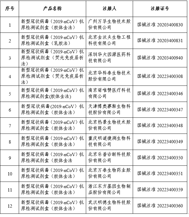 資料顯示,3月12日,國家藥監(jiān)局發(fā)布通告,批準南京諾唯贊、北京金沃夫、深圳華大因源、廣州萬孚生物、北京華科泰生物的新冠抗原產品自測應用申請變更。3月13日,國家藥監(jiān)局再批準5家新冠抗原產品的注冊申請,分別為萬泰生物、熱景生物、天津博奧賽斯生物、重慶明道捷測生物和北京樂普診斷。