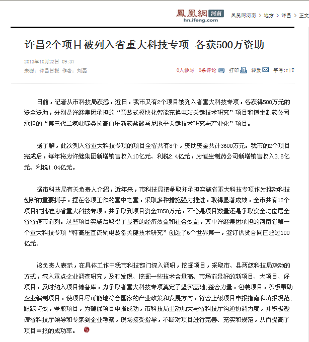 許昌恒生制藥有限公司的項目被列入省重大科技專項