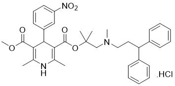 化學(xué)名稱:1,4-二氫-2,6-二甲基-4-(3-硝基苯基)-3,5-吡啶二羧酸 2-[(3,3-二苯丙基)甲基氨基]-1,1-二甲基乙基甲酯鹽酸鹽